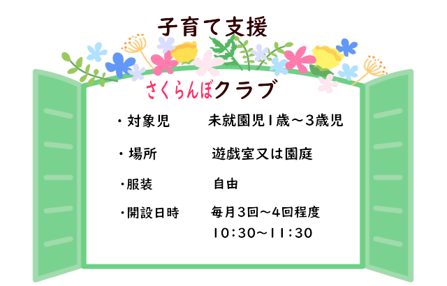 今年度は、園庭で自由に遊ぶ機会を増やしながら実施していきたいと考えています。また「さくらんぼクラブ」でお母さん同士もお子様を通して顔見知り、お知り合いになれる機会になるといいなと思っています。お近くに未就園児のお子様がいらっしゃいましたらお声をかけてくださると嬉しいです。